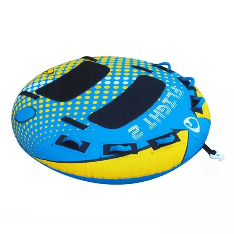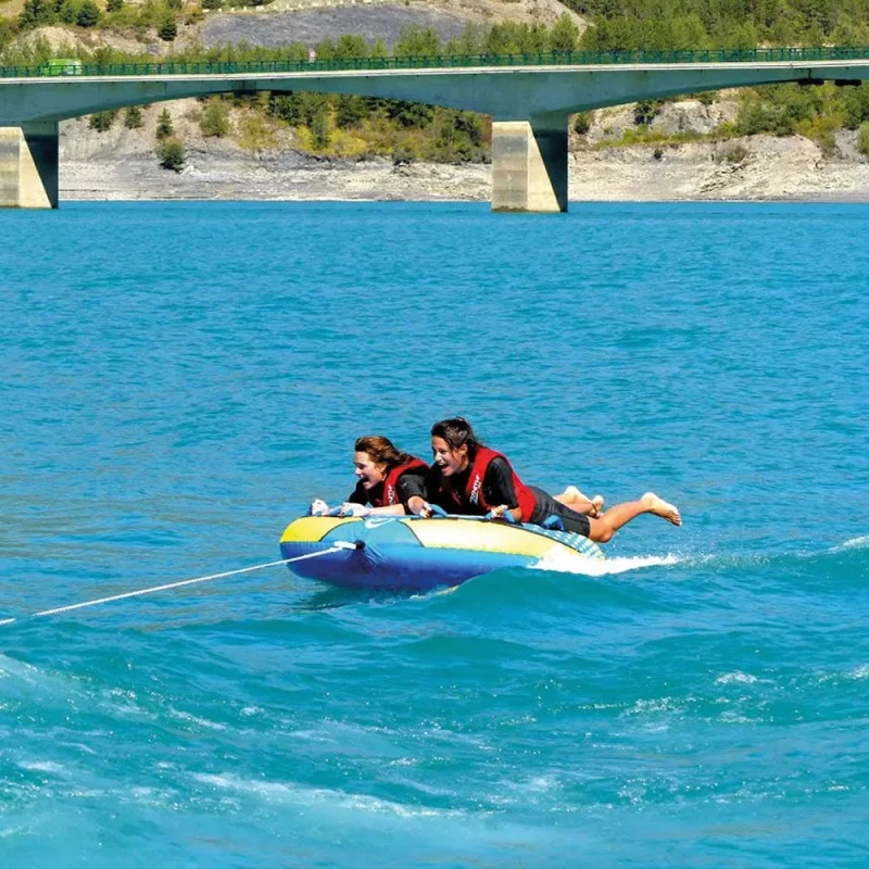 Bouée pour 2 personnes. La bouée comporte de nombreuses poignées et une protection en néoprène pour les coudes et les genoux. Allongé sur le ventre, vous pouvez être catapulté sur la vague arrière du bateau. La bouée est entièrement recouverte de nylon