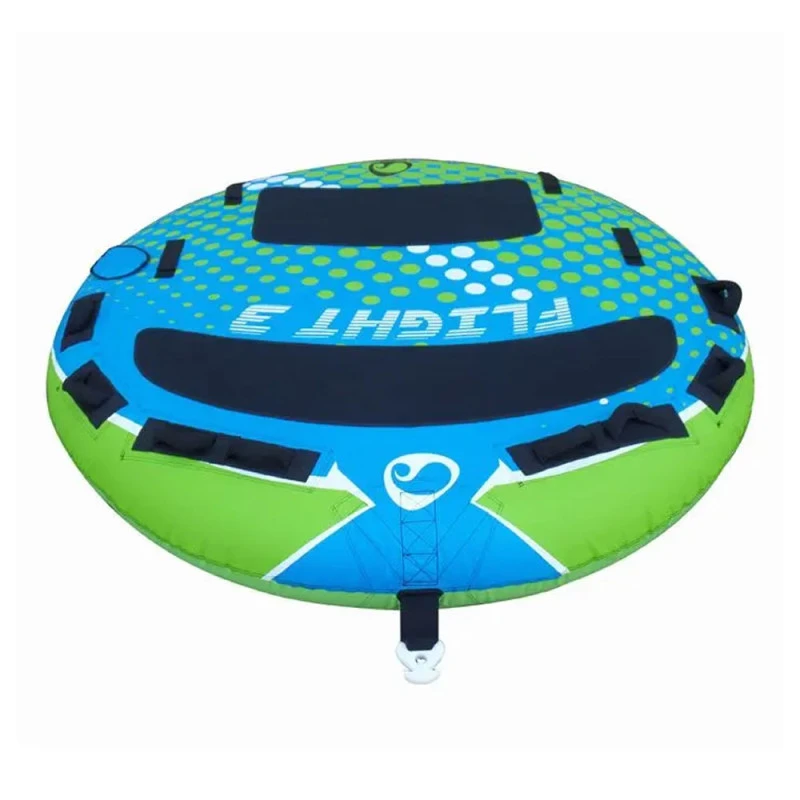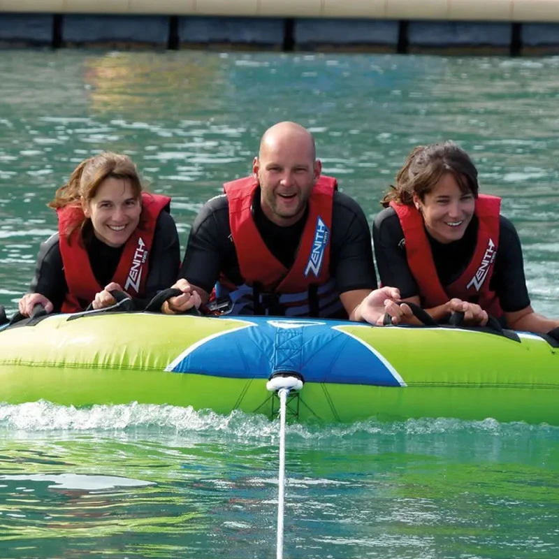 La bouée comporte de nombreuses poignées et une protection en néoprène pour les coudes et les genoux. Allongé sur le ventre, vous pouvez être catapulté sur la vague arrière du bateau.