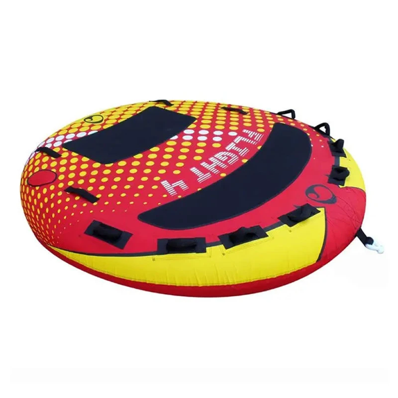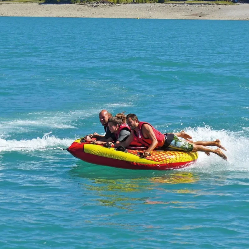 La bouée comporte de nombreuses poignées et une protection en néoprène pour les coudes et les genoux. Allongé sur le ventre, vous pouvez être catapulté sur la vague arrière du bateau.